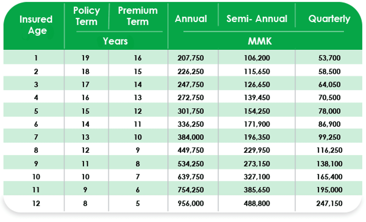 Mr. Kyaw, age 30, a young father, is planning to invest in an education plan for his 1 years old son Chi Chi. He chooses the option of 19 years policy term with the sum assured of 5,000,000 MMK. When Chi Chi is 17 years old, he will receive a guaranteed sum of 1,250,000 MMK in 4 instalments totalling 5,000,000 MMK.